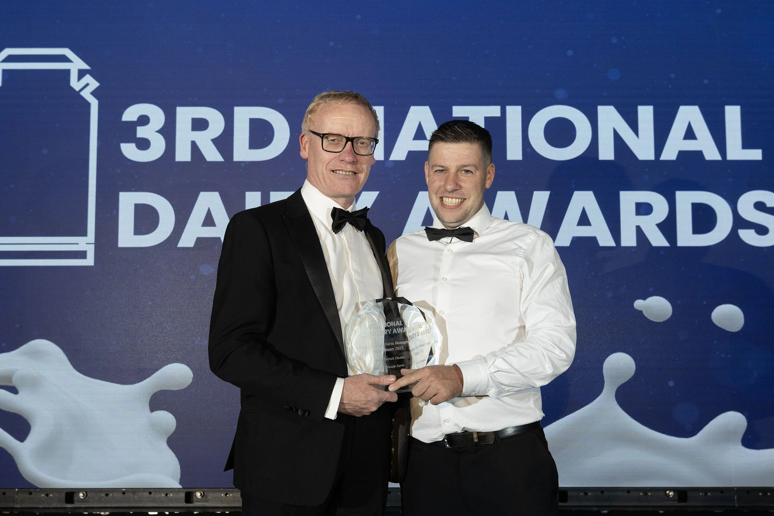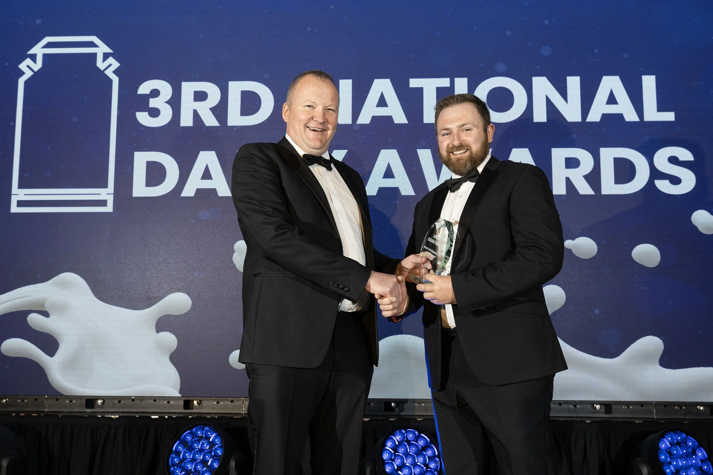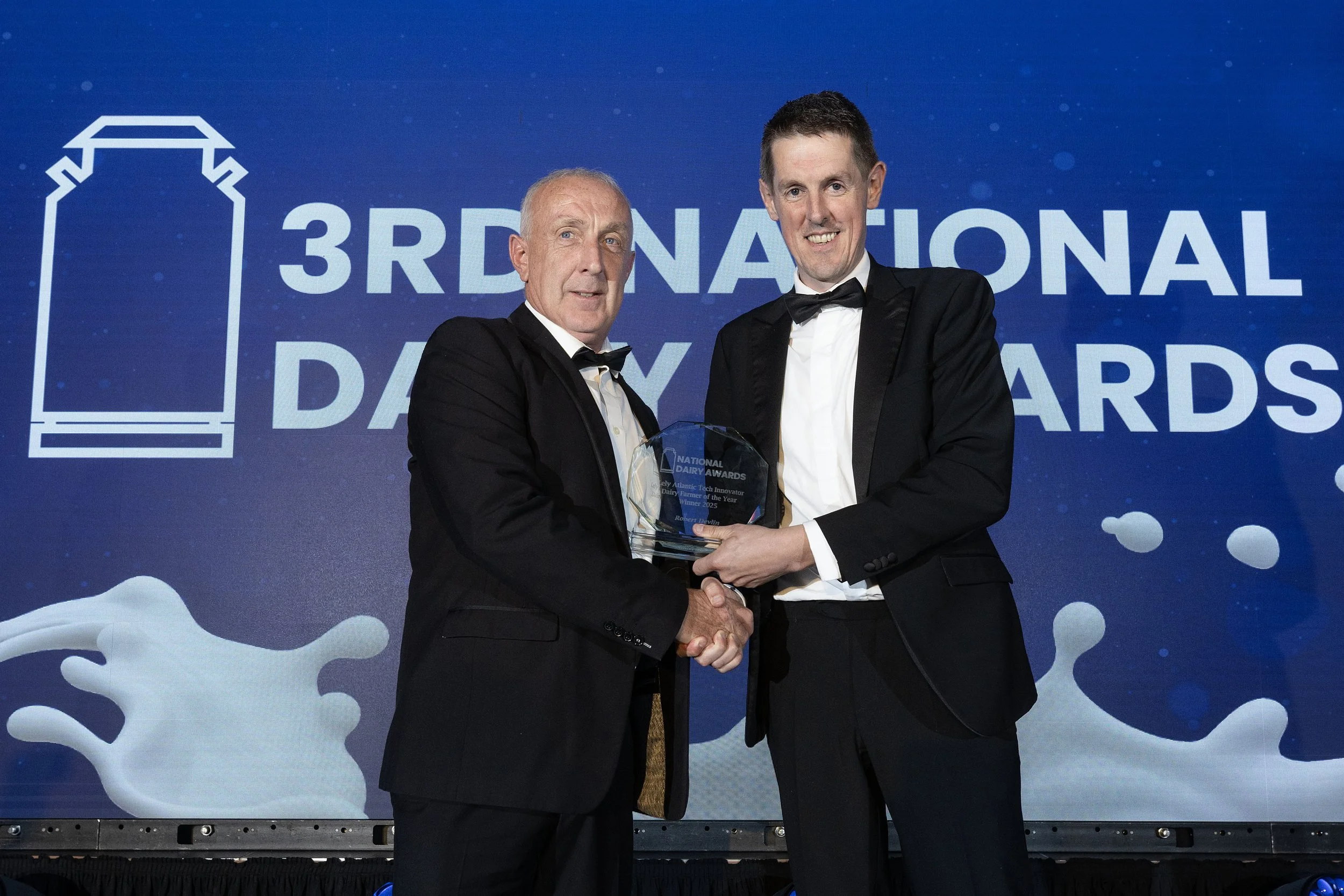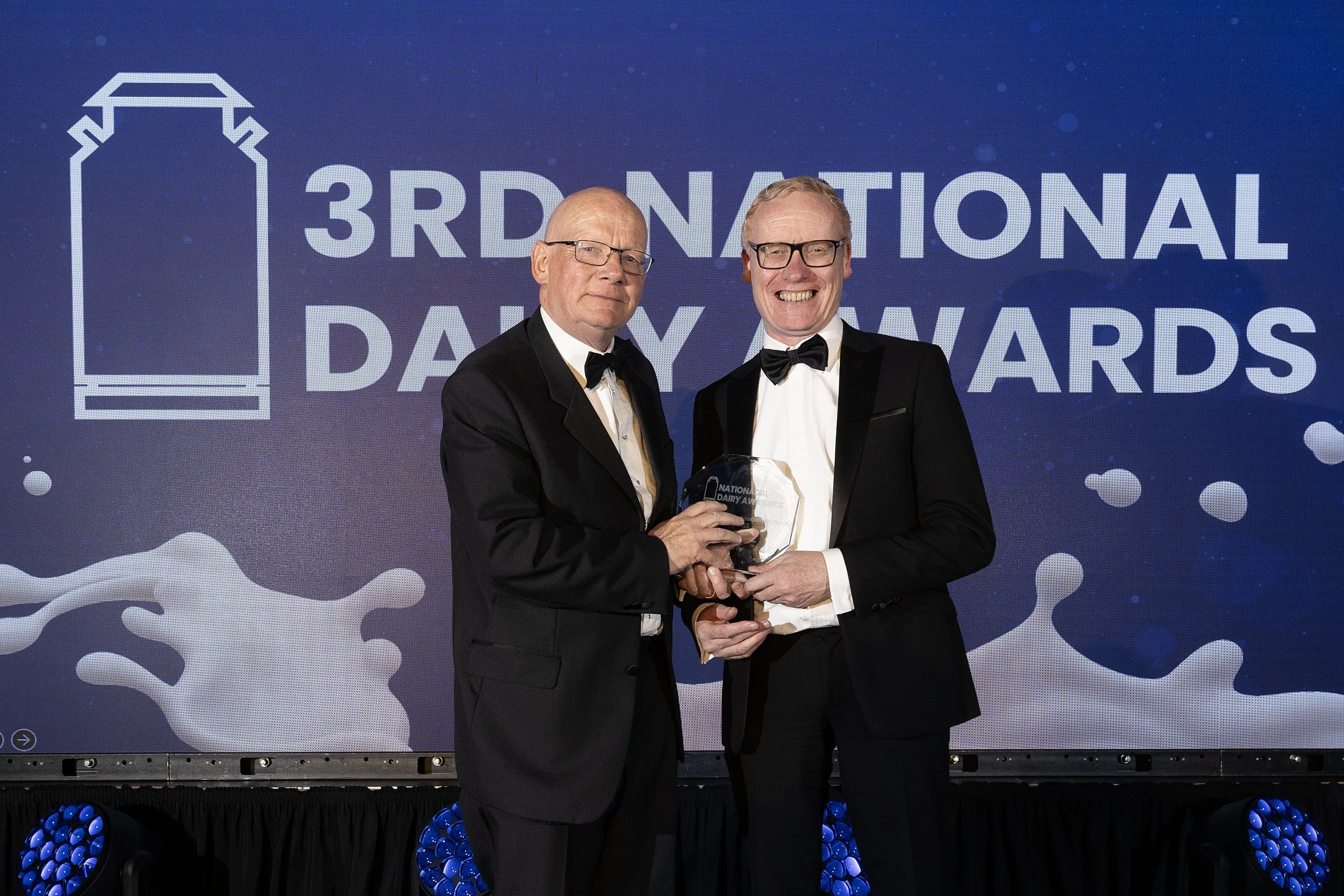Cormac Farrelly (right) presents the Agriland Dairy Leader of the Year award to Conor Mulvihill, Dairy Industry Ireland.