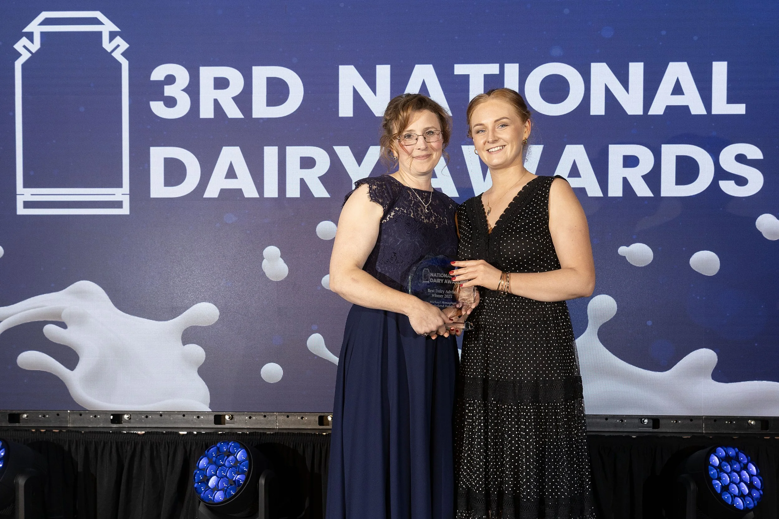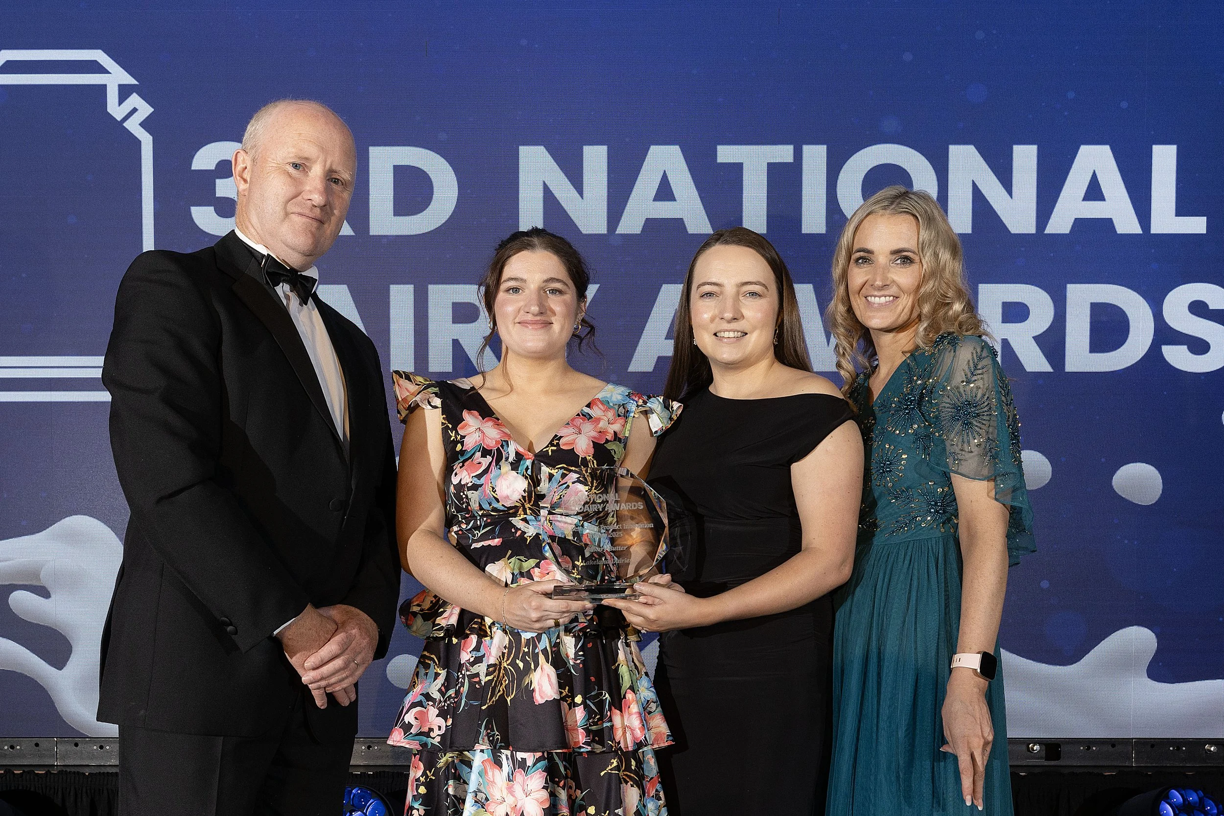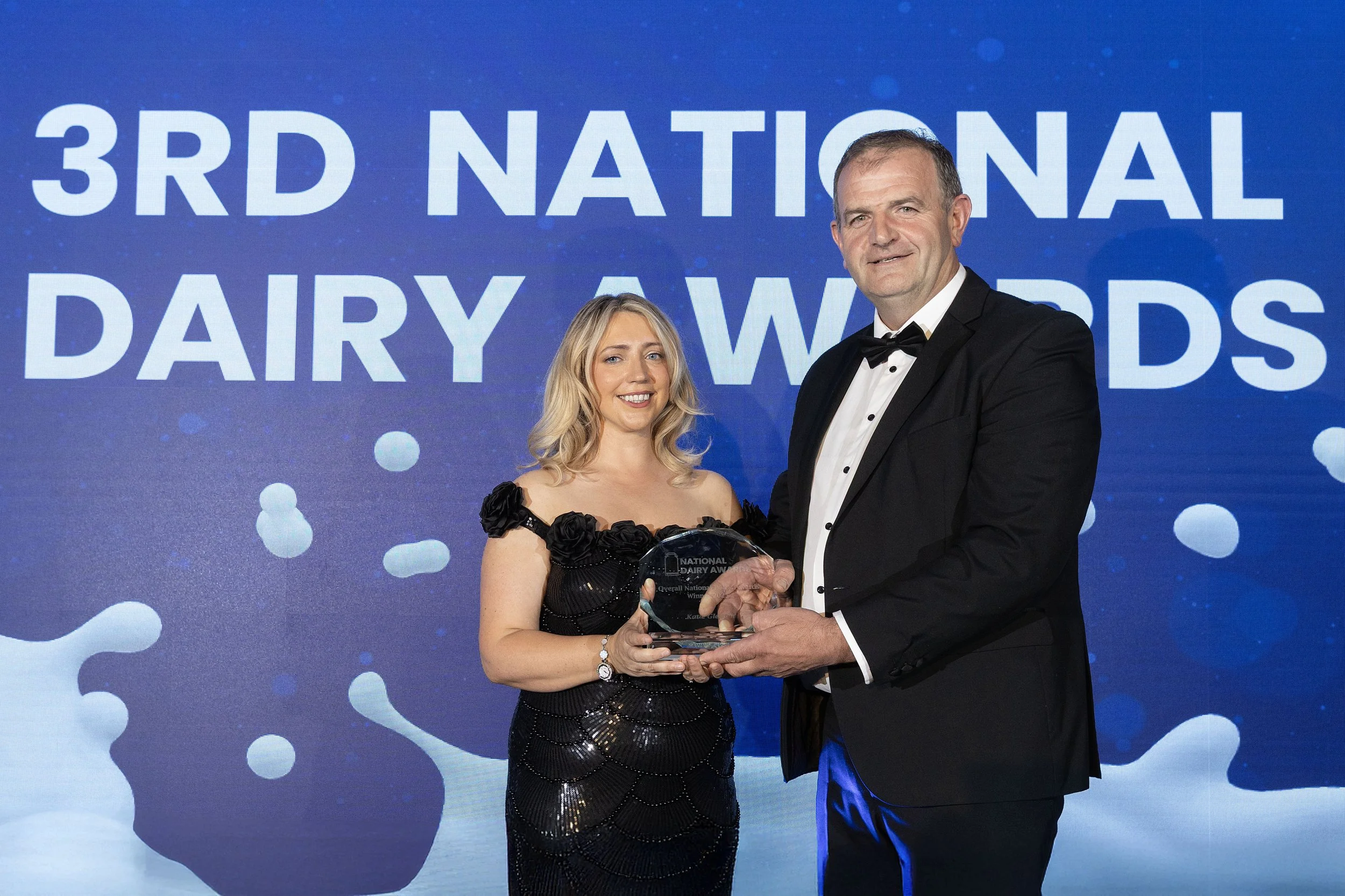 Mary Kinston (left), winner of the Axa Overall National Dairy Award 2024 presenting the Best Dairy Advisor of the year award 2025 to Michael Monaghan Lakeland Dairies, represented by Michelle Taite, Lakeland.