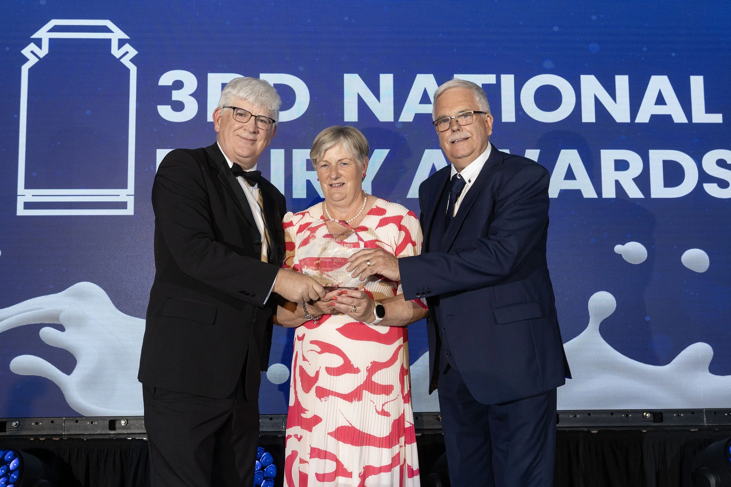 Patrick Ryan (middle) presents the PTSB Dairy Producer / Co-op of the Year award to Carbery Group.