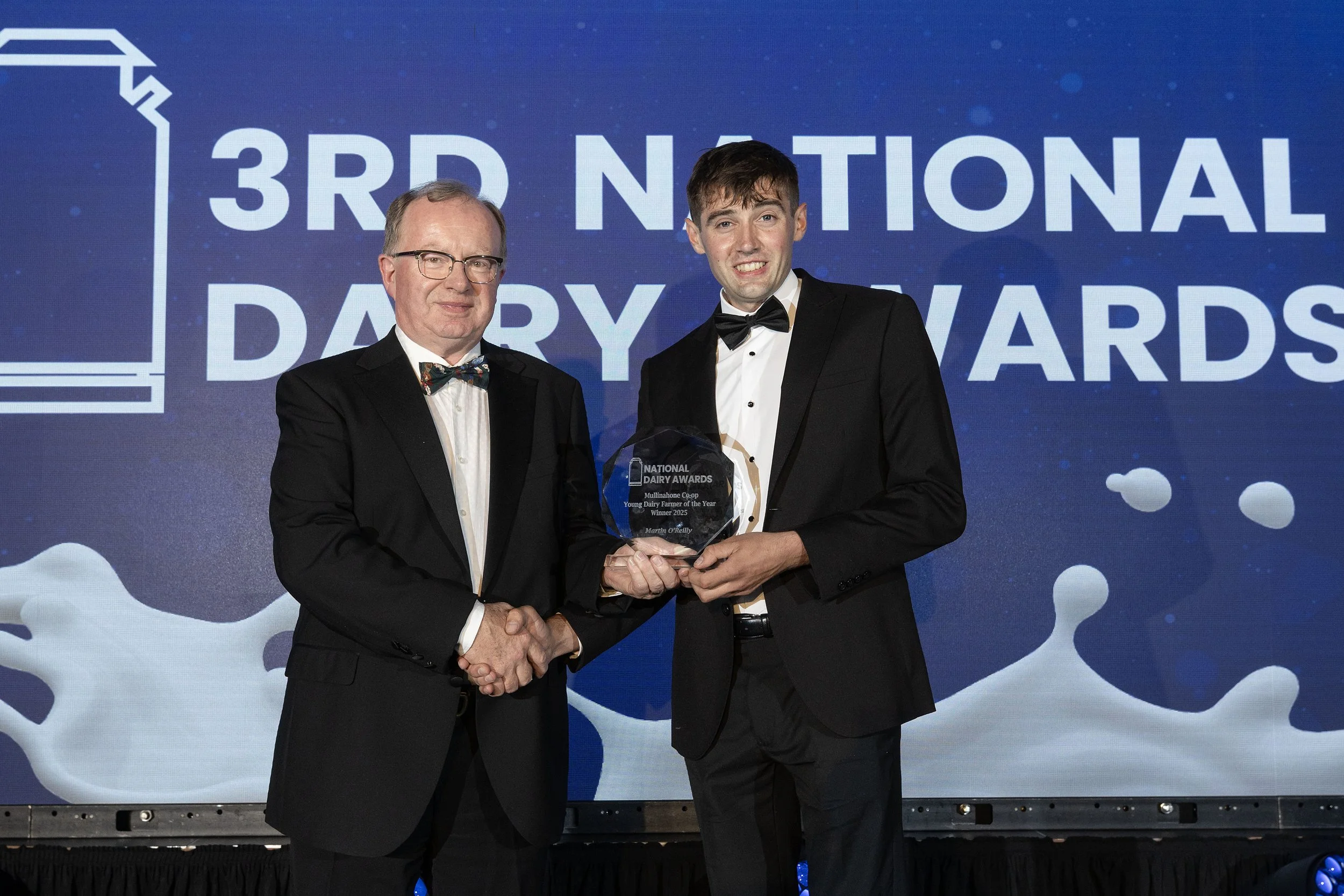 Martin Ryan, Mullinahone Co-op, presents the Mullinahone Co-op Young Dairy Farmer of the Year award to Martin O’Reilly, Cappalug Farm, Co. Carlow.